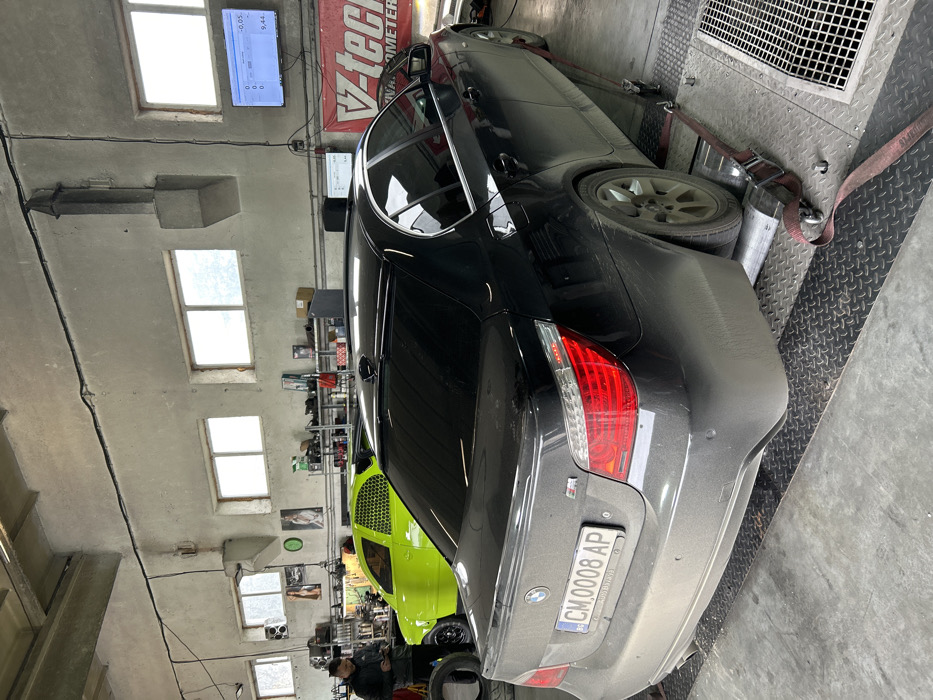 An indoor automotive workshop in Brestnik, Bulgaria, is depicted. A dark grey BMW 5-series sedan (E60 generation), with Bulgarian license plate "CM 0008 AP," is positioned on a dynamometer, its rear facing the viewer. The vehicle, appearing dusty, is secured by red straps over its rear wheels on the dynamometer rollers. To the left, a bright neon green, heavily modified sedan, featuring a mesh instead of a rear window, is parked. A male individual in a dark jacket stands near the green car, focused on a mobile device held in his hands. The workshop features bare concrete walls with multiple rectangular windows, industrial lighting fixtures, and ventilation ducts. Shelving units stocked with various automotive supplies and posters are visible along the back wall. On the right wall, a monitor displays numerical data including "0", "-0,05", and "9,44", positioned above a red banner reading "V-tech Power meter".