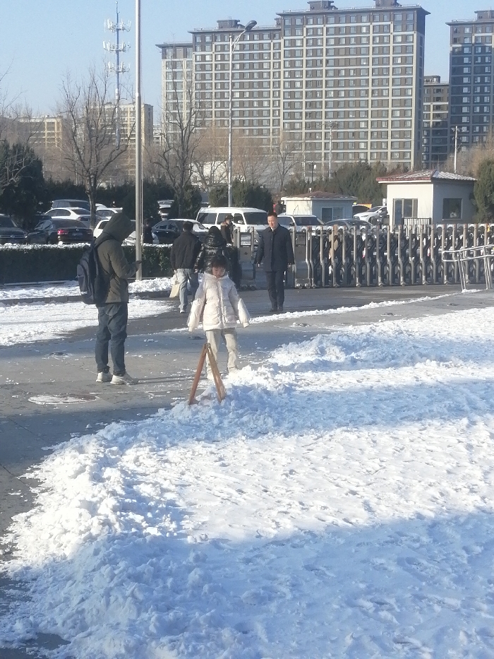 The image depicts an outdoor urban scene in Fengtai District, China, under clear skies with significant snow coverage on the ground