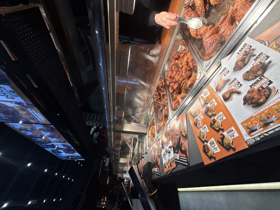 A person is using tongs to serve roasted chicken from a metal tray. The tray is part of a display case showcasing multiple containers of cooked chicken. Promotional signs with prices are prominently displayed beside the trays, advertising options such as "Demi Poulet" and "Poulet Entier." A lit menu board with images of the food can be seen in the background, indicating this is a food service establishment.