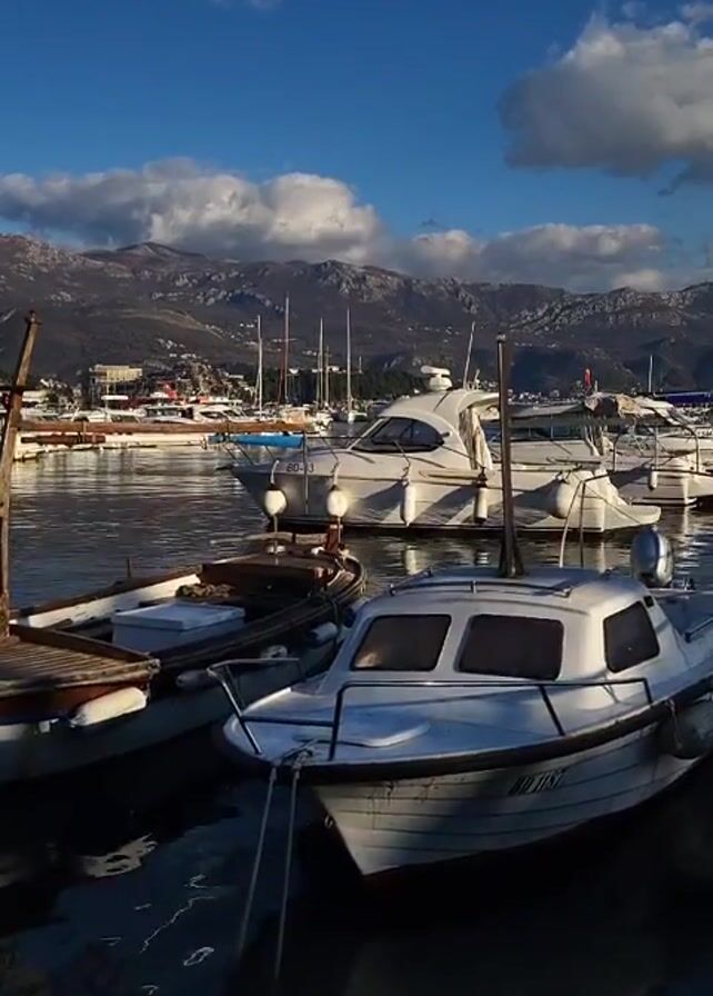 The video depicts a picturesque harbor scene