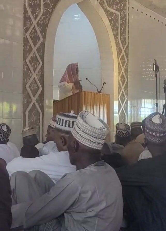 A low-angle shot depicts a group of men in a mosque, sitting on the floor and facing a speaker behind a wooden podium