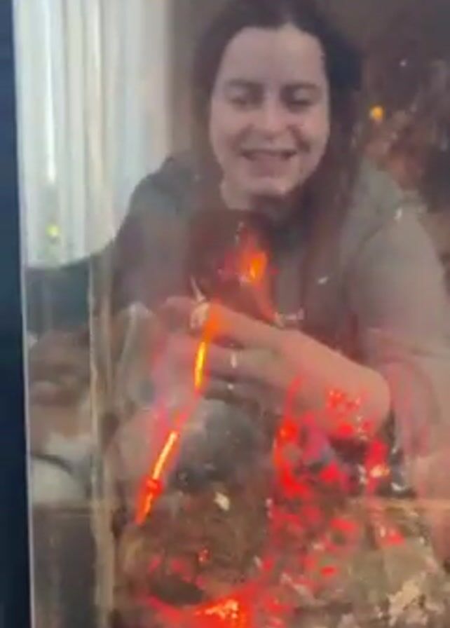 A young woman is sitting and smiling in front of a fireplace. The fire is burning brightly with visible flames and embers. The scene appears to be indoors, possibly in a living room or similar space. The camera angle is positioned so that the fireplace is in the foreground and the woman is slightly blurred in the background.
