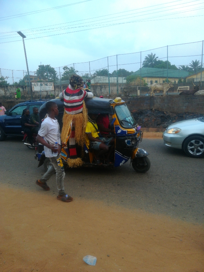 On a road, a three-wheeled auto rickshaw carries a person wearing a traditional mask and costume atop its roof