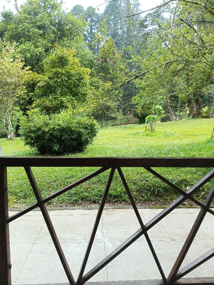 The image displays a verdant outdoor scene in Pachmarhi, India, observed from behind a dark brown wooden railing featuring a geometric pattern of intersecting diagonal bars. Below the railing, a light-colored tiled patio floor exhibits moisture. Beyond the railing lies a lush, green grassy lawn. A dense, spherical green bush is centrally located on the left side of the lawn. The background comprises a thick forest with various species of trees displaying abundant green foliage, extending upwards towards a hazy, light grey sky. No individuals or animals are visible.
