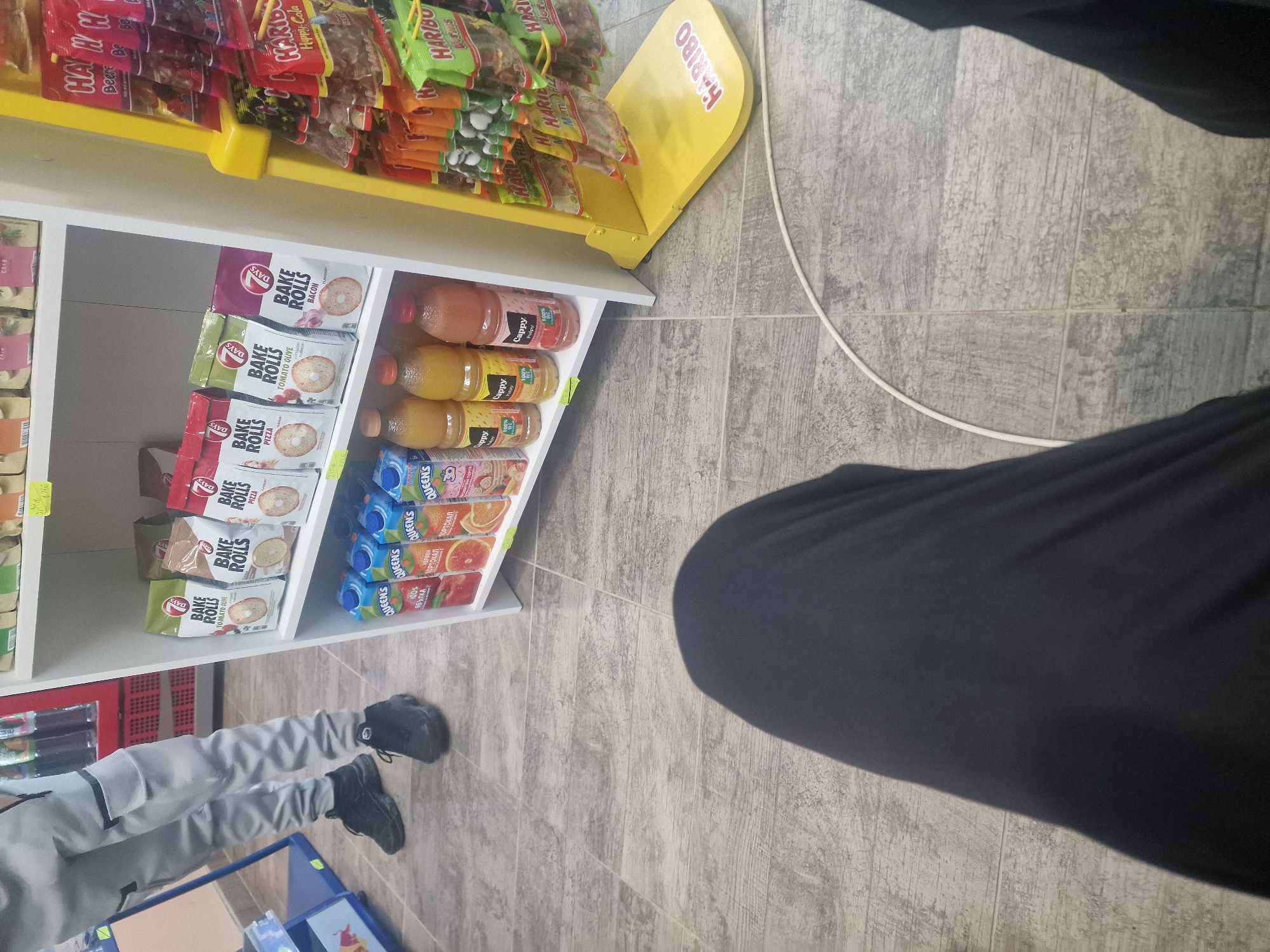 The scene depicts the interior of a small retail store or market, located in Unknown, Unknown. The perspective is low-angle, from the viewpoint of an individual whose legs, clad in black pants, occupy the bottom foreground. A second individual is observed standing to the left, dressed in light grey cargo-style sweatpants and black athletic shoes. Merchandising is prominent on the right: a white shelving unit displays packaged "7 DAYS BAKE ROLLS" (Pizza, Tomato Olive, Bacon varieties) on an upper shelf, and assorted "Queen's" and "Cappy" branded juices on a lower shelf. Immediately to its right stands a yellow floor display unit, branded "HARIBO," containing multiple bags of gummy candies. In the background on the left, a partial red refrigeration unit and a blue "Red Bull" display are visible. The floor is composed of large, rectangular light grey tiles exhibiting a distressed texture. A white electrical cable is loosely coiled on the floor between the viewer and the retail displays. No specific actions or overt interactions are discernible between individuals.