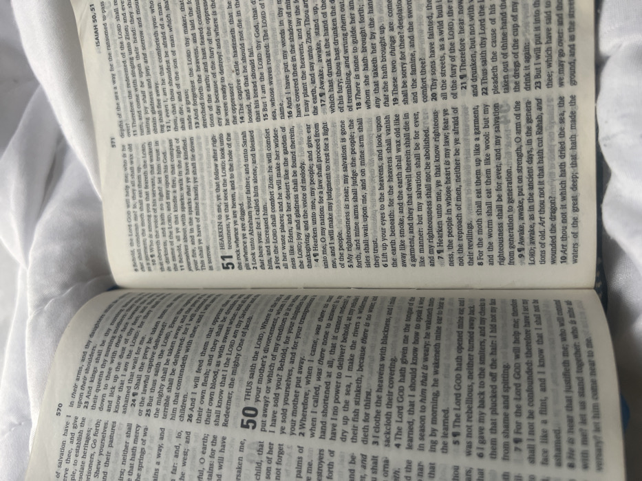 The image displays an open hardback Bible resting on white, wrinkled fabric, located in an indoor setting within the city of Rumuofa, Nigeria. The Bible is open to pages 570 (left) and 571 (right), presenting black text in a standard printed font, with chapter markers "50" and "51" prominently visible. The dark-colored spine of the book is partially visible at the bottom center, between the pages. The white fabric, appearing consistent with bed linens, covers the background. The scene is illuminated by soft, ambient lighting. No individuals, explicit actions, or interactions are depicted.