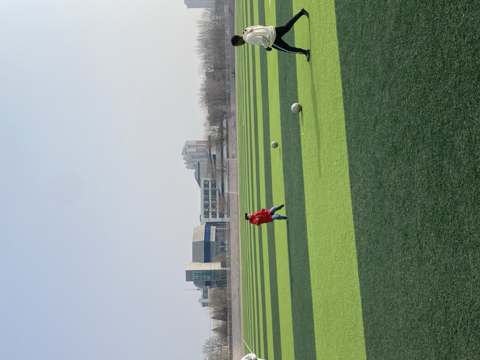 Two people kick soccer balls on a green field marked with stripes. One person wears a white sweatshirt and black pants, while the other wears a red jacket and jeans. Two soccer balls rest on the field. Buildings stand in the background under a hazy sky. The image is slightly rotated to the left.