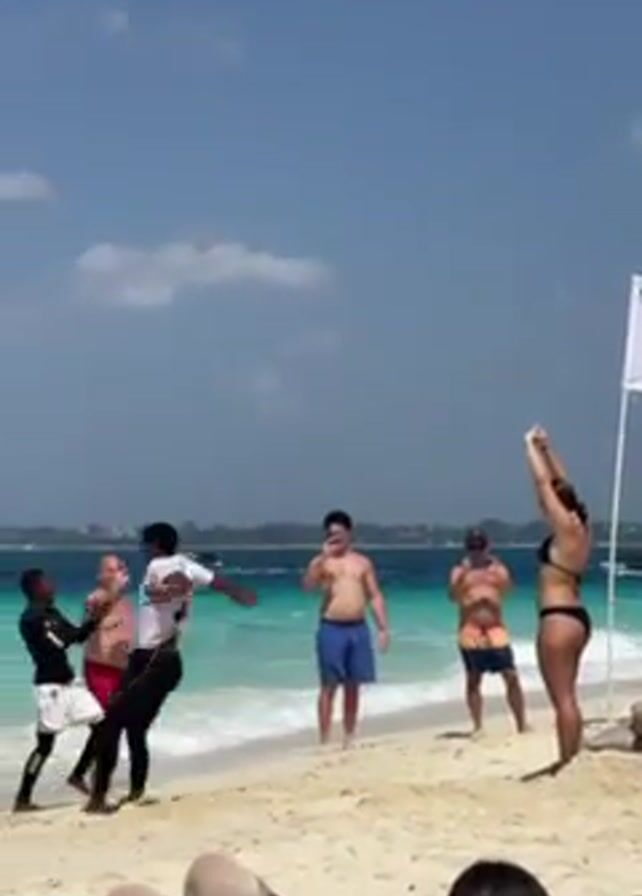 beach scene on a sunny day. A man in a white shirt and black pants executes a backflip on the sand. Surrounding him are other people: a woman in a black bikini raises her arms, a man in blue shorts holds a phone, and another man in patterned shorts also has a phone. A woman in a black bathing suit stands nearby. In the foreground, a person reclines on the sand. A white flag with a logo waves in the background, next to a tire. The turquoise water of the ocean stretches to the horizon, dotted with boats.