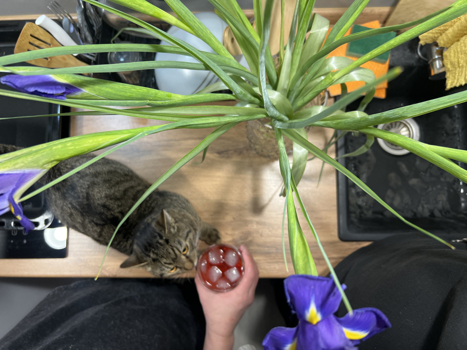This image depicts an interior scene, likely a kitchen, in Simferopol, Ukraine. The perspective is overhead, angled downwards. A domestic tabby cat, characterized by brown and black striped fur and amber eyes, is positioned on a light brown wooden countertop. The cat's head is turned towards a clear glass held by a human hand, appearing to investigate its contents. The hand, attached to a person wearing a dark shirt, holds the glass which contains a red liquid and multiple clear ice cubes, some of which are spherical. Dominating the right side of the frame is a potted plant with numerous long, vibrant green leaves. Two purple iris blooms with yellow accents are visible; one is fully open, and the other is a nascent bud. The plant's container is partially visible, exhibiting a textured, possibly woven, appearance. In the background, a portion of a dark kitchen sink with a metallic drain is visible, containing a minimal amount of water. Adjacent to the sink, a yellow cleaning sponge or cloth rests on the countertop. Further back, blurred elements suggest other kitchen appliances and utensils.