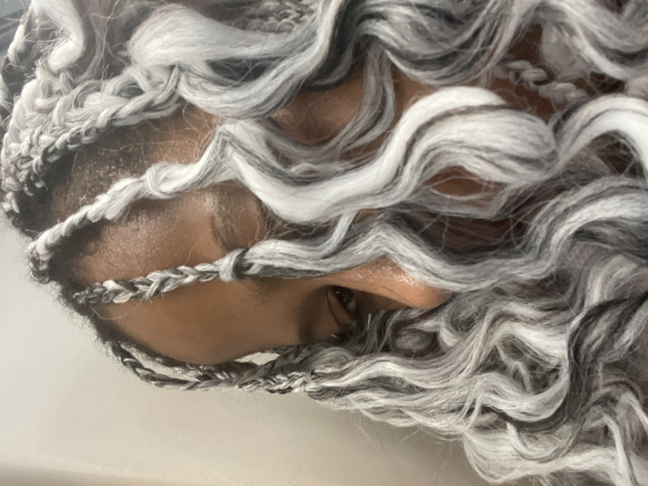 A close-up shows a Black person with long, wavy, gray and white braided hair