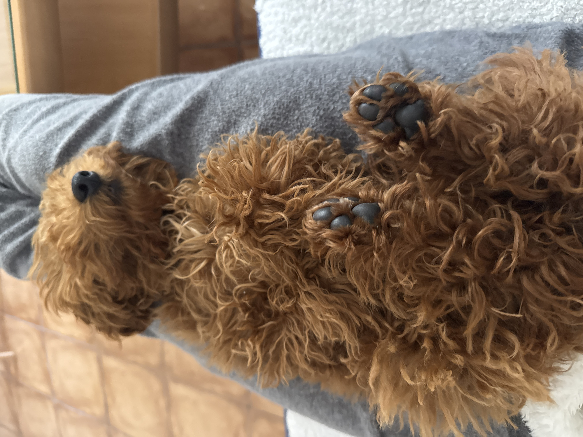 A brown poodle is lying on its back on a gray garment, possibly a t-shirt or sweatshirt. The poodle is positioned in the center of the frame. The poodle is displaying its black paws. The background is out of focus. The location is not discernible from the image provided.