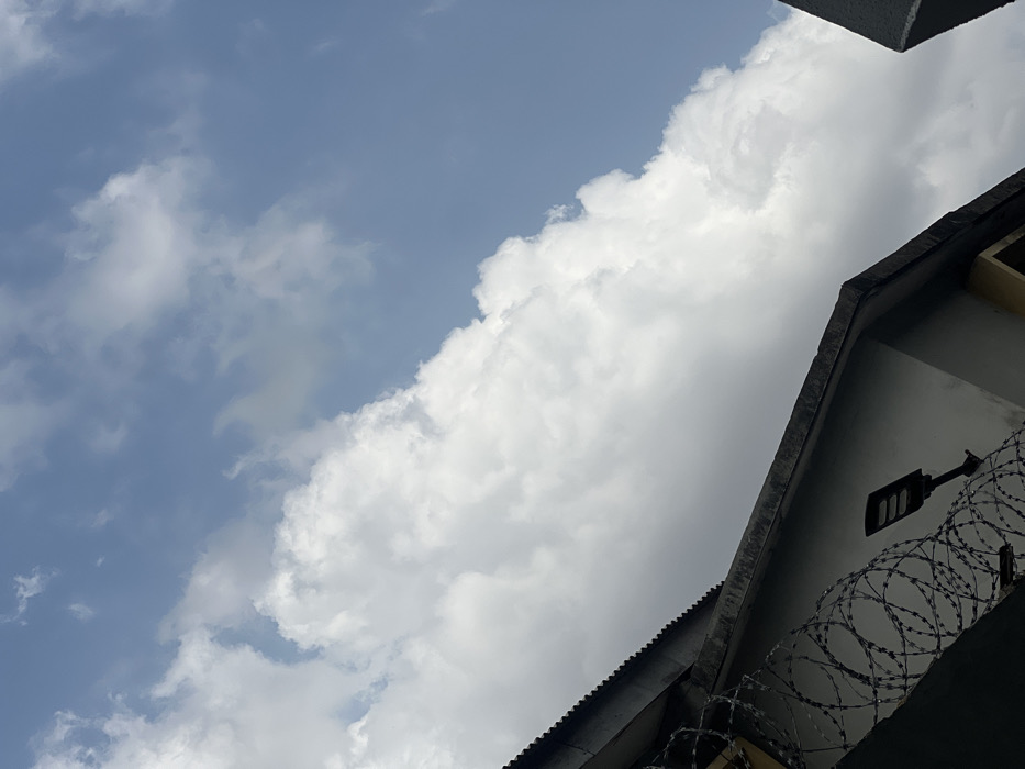 The scene depicts an upward perspective of architectural elements against a partly cloudy sky, located in the city of Ikeja, Nigeria, during daylight hours. The upper-right two-thirds of the frame exhibits a clear blue sky, while the remaining areas are occupied by large, white cumulus clouds, particularly dense on the left side. In the lower-left quadrant, a section of a building is visible, featuring a dark corrugated metal roof and a weathered concrete fascia. A light-colored wall is present below the fascia, on which a dark, rectangular outdoor light fixture is mounted. A dense coil of razor wire is installed prominently in the lower-left, positioned in front of the wall and below the roofline. A narrow, dark grey, vertical architectural element is partially visible along the far right edge of the frame. No individuals are present.