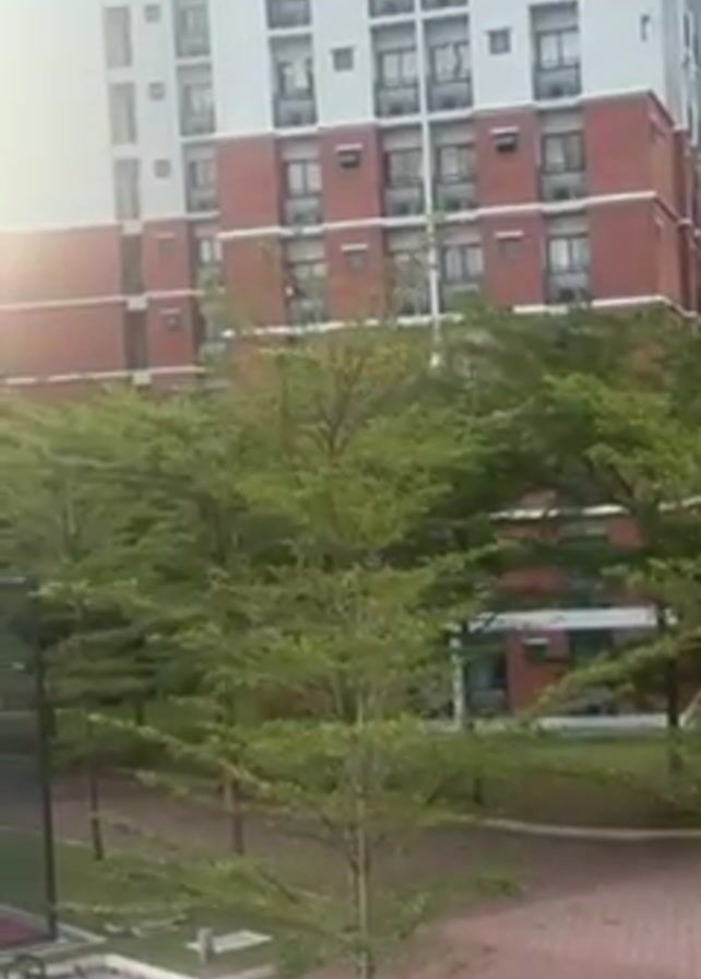 tall building with a red and white facade behind some green trees. The building has many windows and appears to be an apartment complex. A sidewalk paved with red bricks runs along the bottom of the frame. The sky is overcast. Two bicycles are parked to the left of the sidewalk. The camera is stationary. There is no visible human activity.