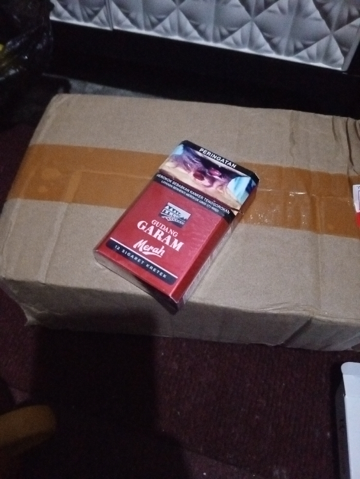 A red pack of Gudang Garam Merah cigarettes rests on a brown cardboard box