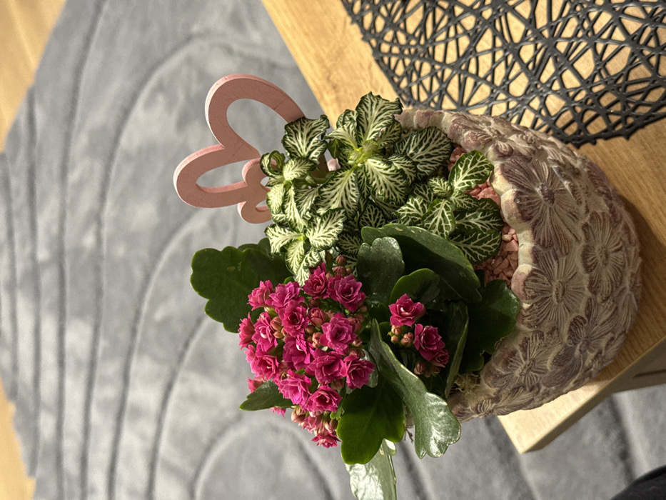 An indoor photograph displays a mixed plant arrangement in a decorative pot, positioned on a light brown wooden surface. The pot is round, light beige-grey, and features an embossed floral pattern resembling daisies. Within the pot, a Kalanchoe plant on the left exhibits clusters of small, vibrant fuchsia-pink flowers and thick, dark green leaves. To its right, a Fittonia (nerve plant) displays small green leaves with distinct white venation. The visible soil is covered with small, light pink pebbles. A light pink, heart-shaped decorative pick, featuring two interconnected hearts, is inserted between the two plants. Adjacent to the pot on the right, a dark-colored placemat with an open, geometric, woven pattern rests on the wooden surface. The background consists of a grey carpet or rug with a subtle, curving design. No individuals are visible. The precise location within Burgas, Bulgaria, is not discernible from the provided image.