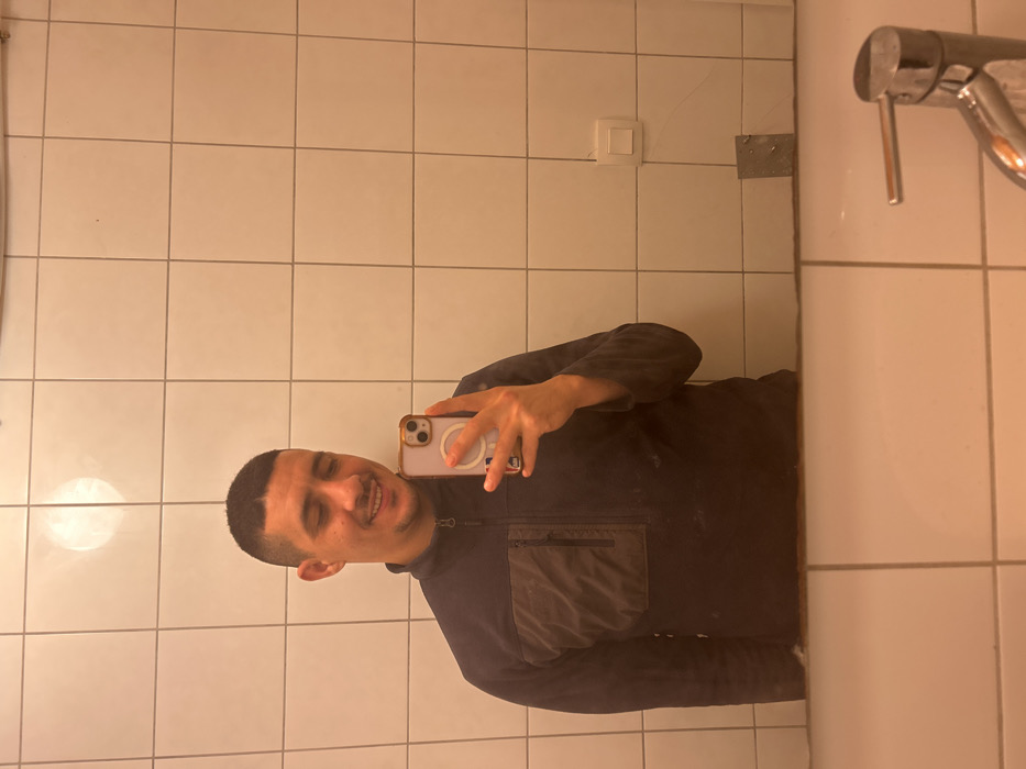 A man stands in a bathroom, holding a phone to take a mirror selfie. He has short, dark hair and wears a dark jacket with a pocket on the chest. The bathroom features square tiles on the wall and a modern chrome faucet. A light switch and a metal mounting plate are visible on the wall behind the man. The overall lighting gives the scene a warm tone.
