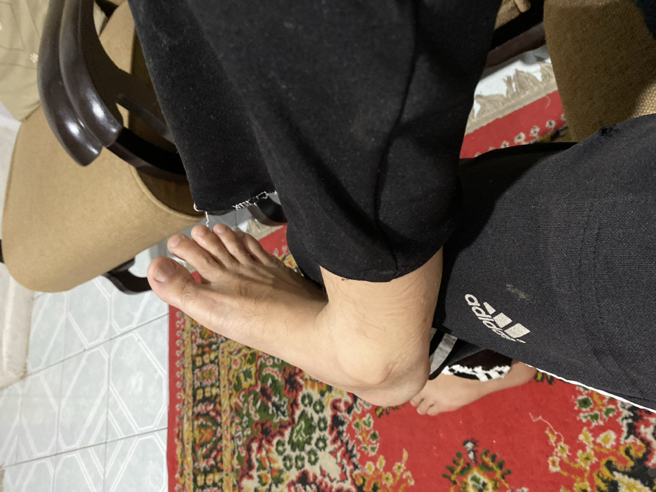 close-up, downward-angled view of a seated individual's lower extremities in an indoor environment in Ciputri, Indonesia