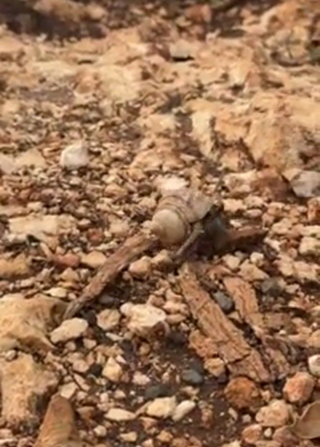 hermit crab crawling on a rocky surface. The surface is covered with small, light brown stones, pieces of dry wood, and small bits of green grass. The hermit crab carries a light-colored, spiraled shell on its back as it moves across the uneven terrain.