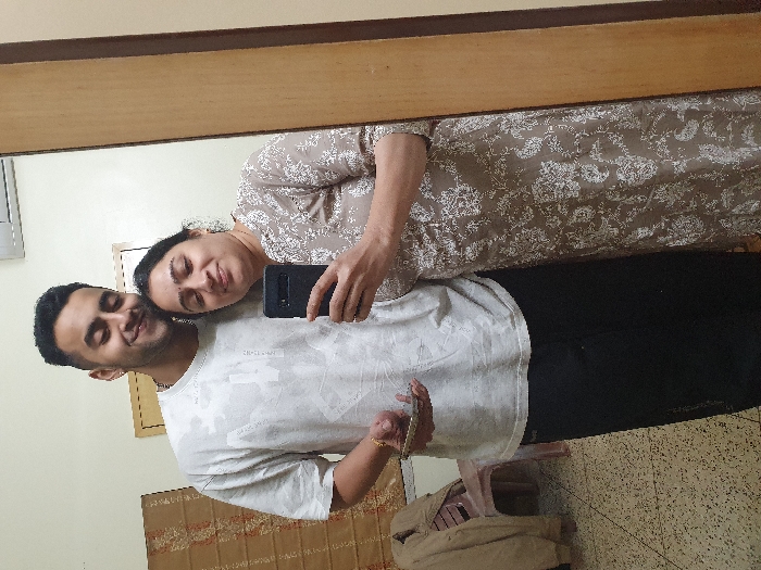 A mirror selfie shows a young man with short dark hair and a white t-shirt leaning into a woman. The woman has her head resting on his shoulder, and is holding a phone to take the picture. She is wearing a patterned beige dress. They both appear to be smiling. The background shows a neutral-toned room with a patterned floor and furniture.