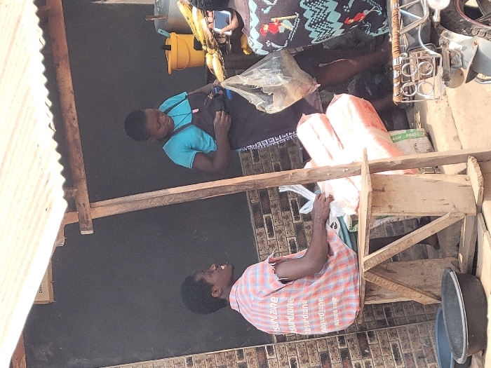 The image depicts an outdoor vendor stall in Awka, Nigeria, under direct sunlight