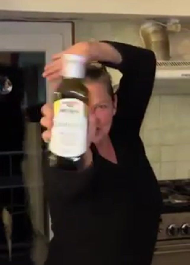 A woman stands in a kitchen holding a bottle of oil. She has sunglasses on her head and a black long-sleeved shirt on. She's raising one arm above her head and pointing the bottle towards the viewer. Behind her, there is a tiled wall, a stove with a gas flame, and a door. There is also what looks like a dishwasher or drying rack visible in the reflection of the door.