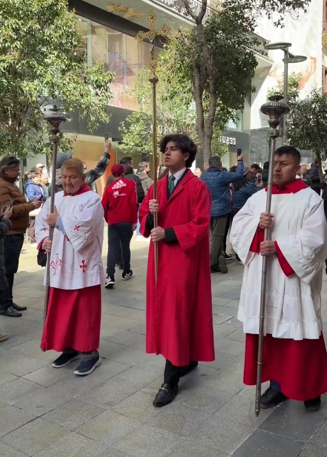 religious procession moving down a street, with people watching from the sides. In the foreground, three individuals are dressed in religious garb. The first and third are wearing white robes with red crosses and red skirts, carrying long silver-colored staves. The person in the middle is wearing a red robe and holding a golden cross high. Behind them, a brass band marches, led by someone carrying a flag. The band members are wearing blue uniforms with red accents. The crowd on either side of the street is diverse, with people of various ages and clothing styles. Many are holding up their phones to take pictures or videos. The setting is an urban environment, with buildings lining the street. Trees are planted along the sidewalk, and the sky is blue and sunny. The atmosphere is that of a public event, with people gathered to observe and participate in the procession.