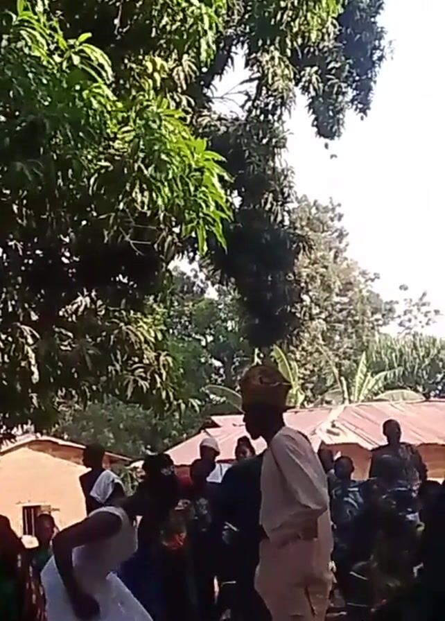 n outdoor gathering of people in what appears to be a village or rural area. The event seems celebratory, possibly a wedding, as there is a woman in a white dress who appears to be the bride. A man next to her is wearing a khaki-colored suit and a traditional hat. Other people are standing around, some seated on plastic chairs. The background includes buildings with corrugated iron roofs and dense green foliage. A large tree dominates the left side of the frame, obscuring some of the scene. There is movement and activity, and the overall atmosphere seems lively.