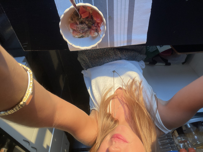 A partial view of an individual, identified as being in Aldoar, Foz do Douro e Nevogilde, Portugal, is captured in a selfie-style photograph. The subject, a person with light-colored hair, is visible from the upper chest to the top of the head, wearing a white sleeveless top, a delicate necklace with a small pendant, and a gold-toned bracelet on the right wrist. A leopard-print patterned lower garment is also visible. The person is seated at a dark-surfaced table featuring a white and grey striped placemat. On the placemat, a white scalloped bowl contains a meal consisting of a light base, topped with diced red fruit, dark seeds, and green herbs, with a spoon placed inside. The background suggests an indoor domestic setting, likely a kitchen or dining area, showing glass bottles and jars on a counter to the left and white cabinetry with a dark handle to the right. Strong natural light, originating from the right, illuminates the scene, creating distinct highlights and shadows.