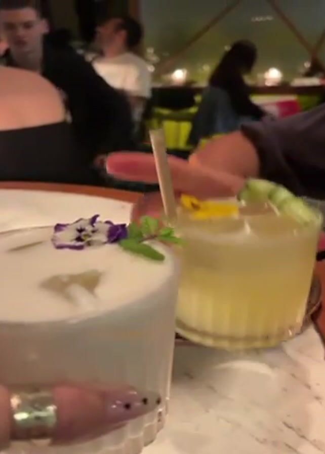 two cocktails sitting on a round table in what appears to be a bar or restaurant. The cocktail on the left is taller, white, and garnished with a purple flower and mint sprig. The cocktail on the right is shorter, yellow, garnished with a yellow flower and cucumber slice, and has a straw. A person with a ring on their finger is holding a phone or camera, presumably recording. Several other people are seated at nearby tables, including two men and a woman. The overall atmosphere seems relaxed and dimly lit.