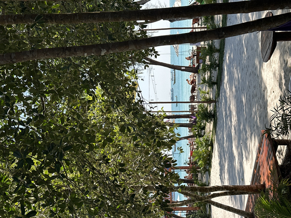 A beach scene is glimpsed through tree trunks and foliage. The ocean, dotted with boats, stretches to the horizon under a pale sky. The sandy beach is lined with trees and small plants, where people are seated at tables. A sandy path runs alongside the beach, leading the eye into the distance. The image is taken from a slightly elevated and obscured position.