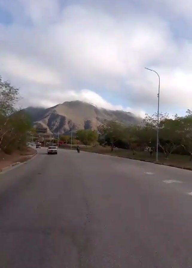The video depicts an asphalt road stretching towards a mountain partially obscured by clouds