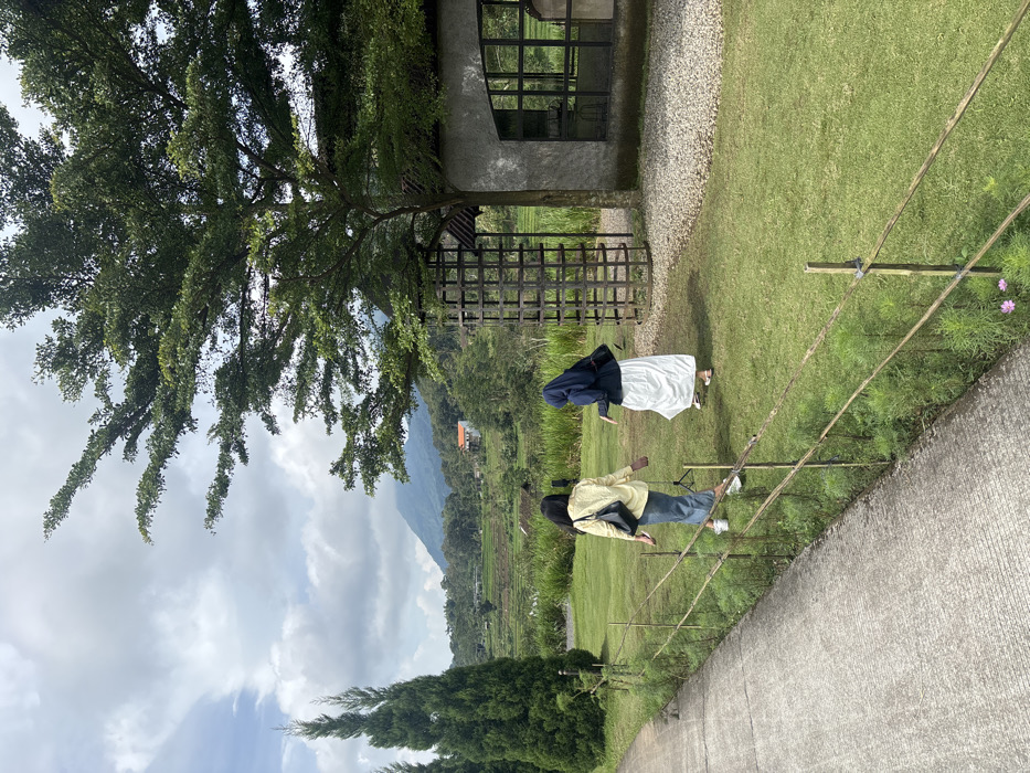 Two people stand in a green yard with tall grass. One wears a yellow top and jeans, while the other wears a dark blue and white outfit. A tree with dense foliage is at the top left. A stone-walled building with a window and a gravel path are behind the people. A metal fence-like structure is near the tree. A mountain and rice paddies are visible in the background under a cloudy sky. A cement path runs along the bottom of the image.