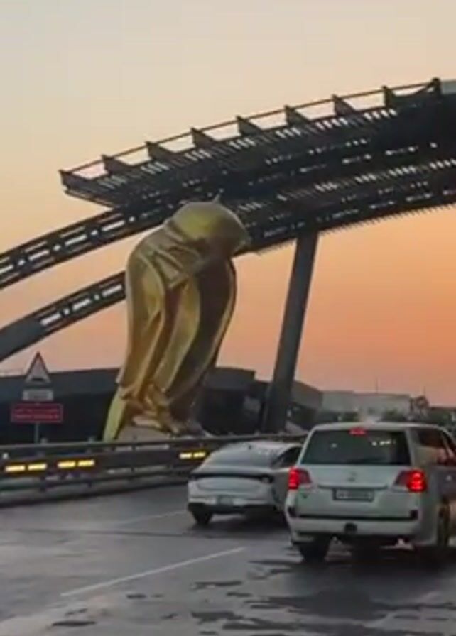 golden statue of a falcon standing on a large, modern-looking metal structure alongside a road