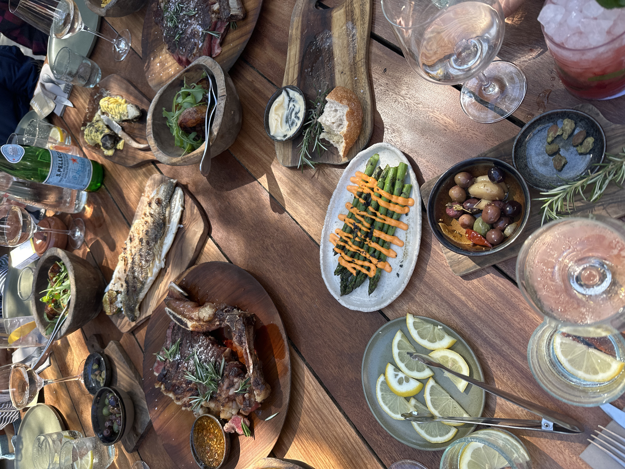 The image captures a dining scene on a wooden table, likely outdoors due to the natural lighting. The table is laden with various dishes including grilled steak, fish, asparagus with orange sauce, olives, bread with a spread, lemon slices with tongs, corn, and salad in wooden bowls. Beverages are present, including a bottle of San Pellegrino sparkling water and drinks in glasses, one appearing to be a cocktail. Utensils such as forks and knives are visible. The setting appears to be in Sant Antoni de Portmany, Spain. People are either present or have recently dined at the table, though they are not fully visible in the frame.