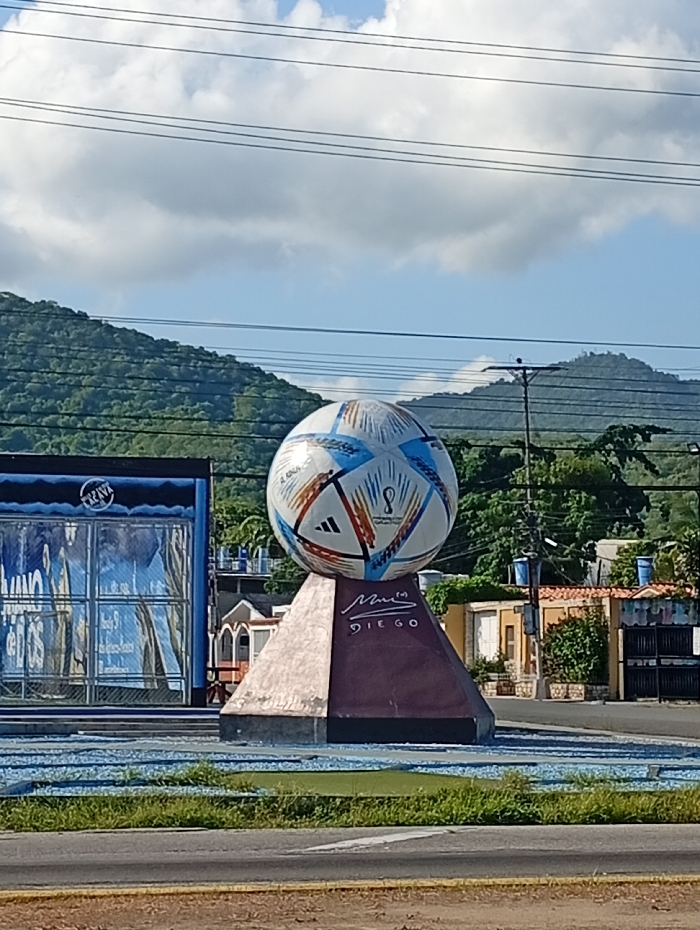 The image displays a static outdoor scene featuring a prominent football monument located within a traffic roundabout in Puerto Cabello, Venezuela. The central subject is an oversized replica of the Adidas Al Rihla official match ball from the 2022 FIFA World Cup, rendered in white with blue, red, and orange geometric patterns, and bearing the FIFA World Cup 2022 logo. This spherical monument rests upon a polygonal, pyramidal base. One visible section of the base is a lighter brown, while an adjacent section is a darker reddish-brown. Inscribed on the darker section are a signature, including the initial '(M)', positioned above the name 'DIEGO'. The monument is situated within a circular median or traffic island, which is predominantly covered with a mixture of light blue and darker blue gravel or crushed stone, interspersed with small patches of green grass. In the immediate foreground, a paved road surface with a visible white directional arrow and yellow road markings occupies the bottom of the frame. To the left of the monument, a blue-colored commercial structure, possibly a kiosk or small building, features multiple glass-paneled sections exhibiting reflections. Partially legible text, including 'IZAWA' or 'IZAVA', is visible on its facade. To the right and further back, various residential-style buildings with distinct colored facades and tiled roofs are visible, surrounded by scattered green foliage. The background is dominated by a range of lush green, tree-covered mountains set against a partly cloudy blue sky. Multiple horizontal power lines traverse the upper portion of the image, with a utility pole supporting these lines visible to the right of the monument. No individuals are present within the depicted scene.
