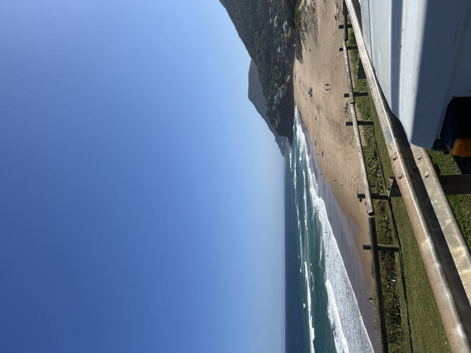 From an elevated perspective, a coastline featuring a beach with waves meeting the sand stretches along the frame. The horizon is visible, separating the ocean from a clear blue sky. A tree-covered cliff or hill provides a scenic backdrop along the beach. A railing runs along the right side of the frame, suggesting a vantage point from a balcony or walkway.