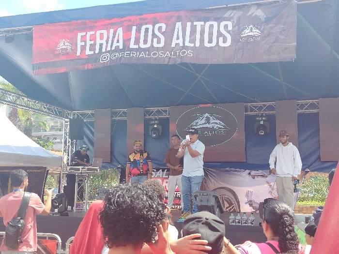 The image depicts an outdoor event identified as "FERIA LOS ALTOS" occurring on a clear, sunny day in Carrizal, Venezuela