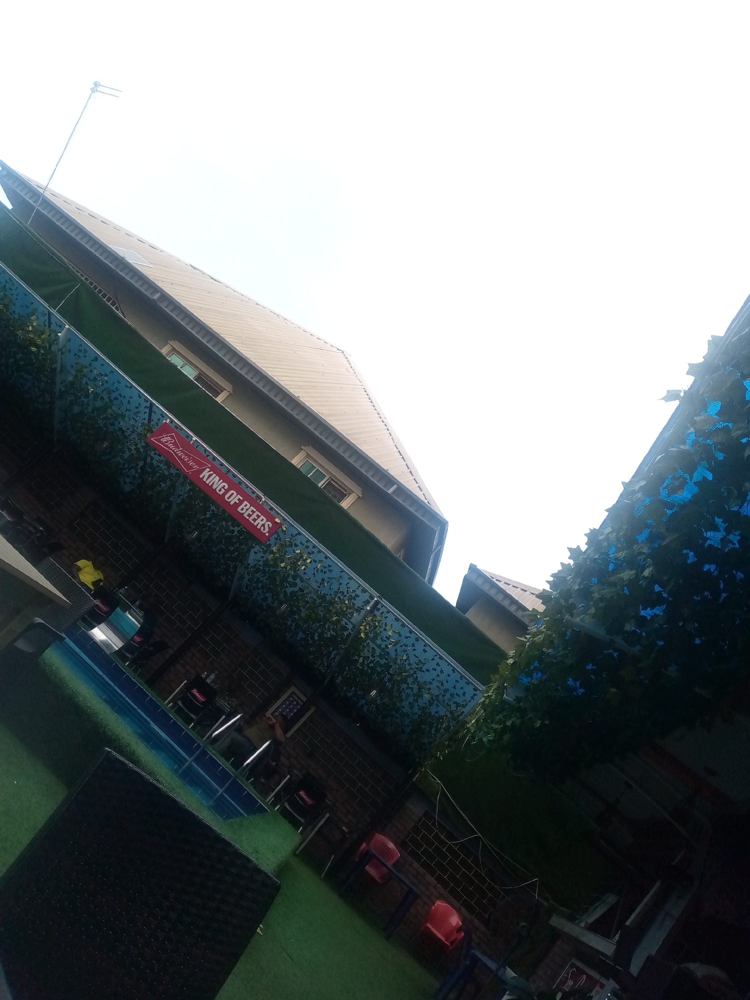 n outdoor seating area in what appears to be a bar or restaurant. There are tables and chairs arranged on artificial green turf. The area is bordered by a wall decorated with artificial foliage and a "Budweiser KING OF BEERS" sign. Overhead, there are building structures and an antenna visible against a bright sky. The lighting is uneven, with some areas in shadow. The location is Asaba, Nigeria.