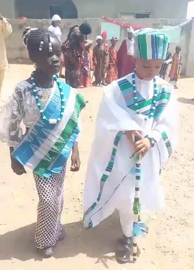 In a sunny outdoor setting, a video captures two children dressed in traditional attire
