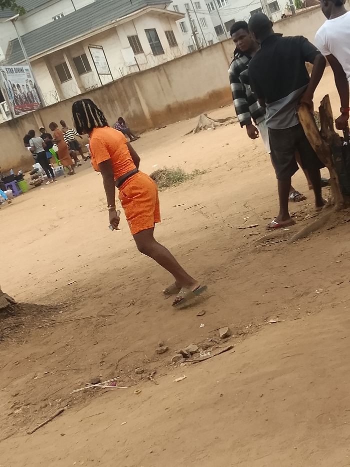 The image displays an outdoor street scene in Umuokpu, Nigeria, primarily characterized by reddish-brown dirt ground. In the foreground, a person with dark skin, appearing female, is depicted from a rear-left perspective, angled slightly forward, as if in motion. This individual wears a matching orange short-sleeved crop top and orange shorts, with dark braided hair visible. Light-colored flip-flops are on their feet, and a small white object is held in the left hand. To the left midground, a group of several individuals is gathered; some are standing, and others are seated on low stools near various items including a blue bucket and a green stool, suggesting a casual roadside setup. In the right midground, three men are visible. The central man wears a black short-sleeved shirt over a grey undergarment, dark shorts, and light-colored flip-flops, holding a large, rough wooden branch or stump. Behind him, another man wears a black and white striped long-sleeved shirt, looking towards the left. A third man, partially visible on the far right, wears a white t-shirt. A tree stump is present on the right near the men. The background features a light-colored building with a dark sloped roof and multiple rectangular windows, fronted by a low concrete wall topped with barbed wire. A large poster, displaying text such as "STAR DIVINE" and multiple portraits, is affixed to this wall. Further behind, a taller, multi-story building with numerous windows is visible under a bright, overcast sky.
