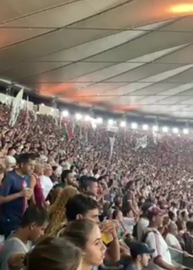 large crowd of people in a stadium, likely attending a sporting event. The camera pans upwards, revealing the stadium's roof structure and the rows of spectators filling the stands. Many people are wearing team colors and holding flags, suggesting they are supporters of one of the teams playing. The stadium is brightly lit, and a game appears to be in progress on the field below. The crowd seems excited and engaged with the event.
