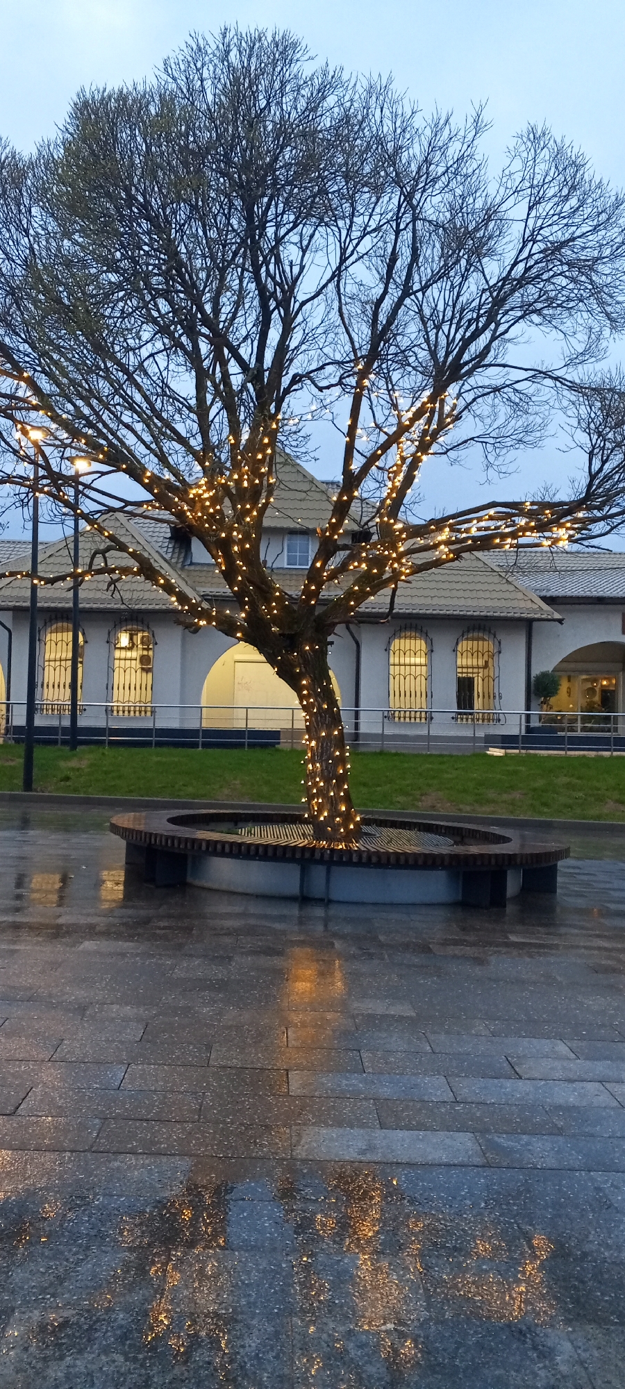 The image depicts a tree decorated with lights in a public space, likely a square or pedestrian area. The tree is bare of leaves, suggesting it is late fall or winter. A circular bench surrounds the base of the tree. The ground is paved with stone blocks and appears wet, indicating recent rain. In the background, a low building with a light-colored facade is visible, featuring arched windows and a tiled roof. The sky is overcast. The location is Dmitrov, Russia. No people are visible.