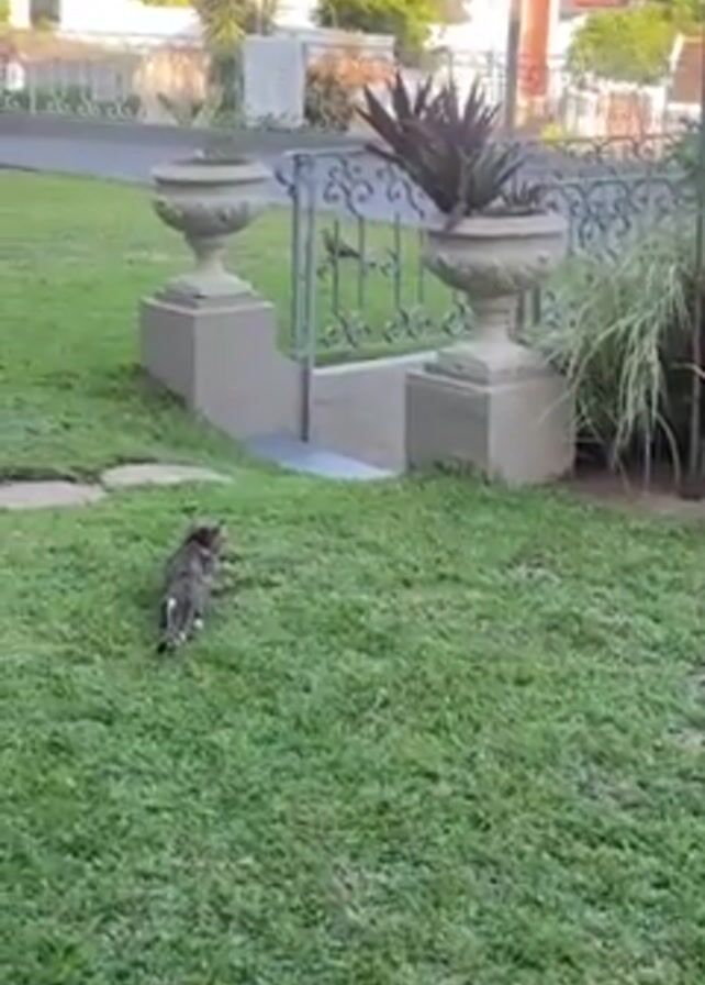 cat walking across a green lawn towards a gate. The gate is flanked by two ornate planters on pedestals, one of which holds a spiky plant. Behind the gate, the sidewalk and street are visible. In the background, there are houses and trees, with a hint of early morning or late afternoon sunlight. The cat is mostly gray with darker stripes and a bushy tail.