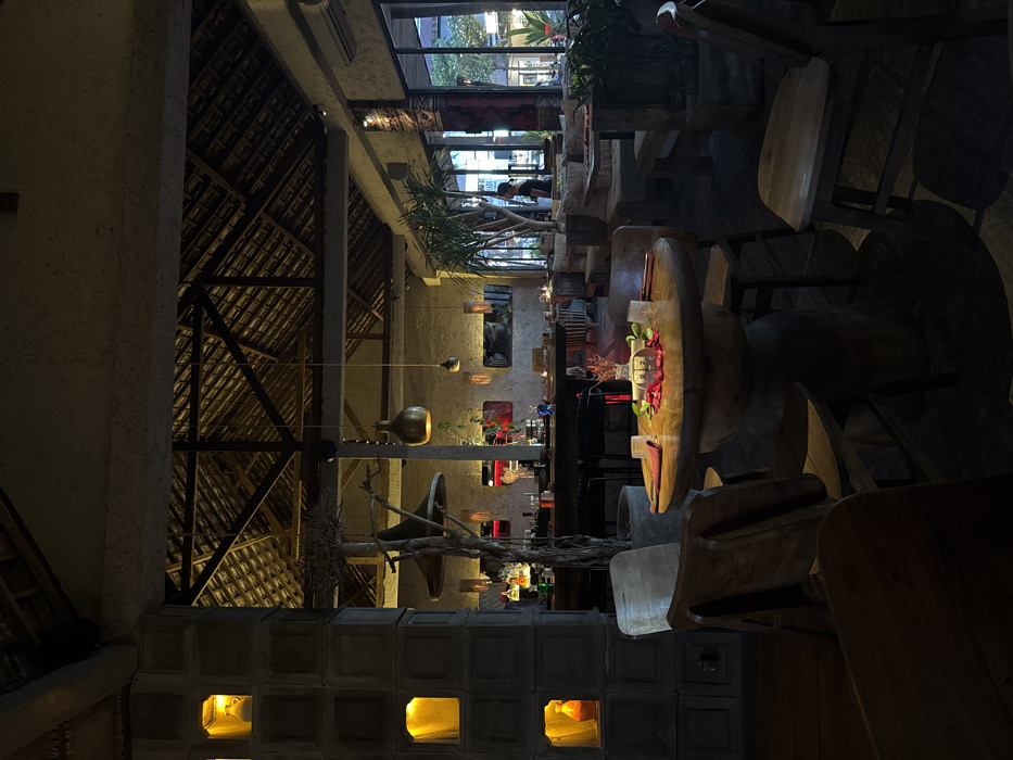This image depicts the dimly lit interior of a restaurant or bar located in Canggu, Indonesia