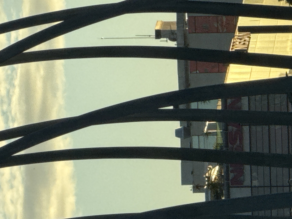 A distorted view through curved metal bars reveals buildings with a modern architectural style. The buildings feature a mix of glass and solid panels, reflecting the sunlight. "NISSAN" is visible on one of the buildings, although partially obscured. The sky is pale blue with hints of clouds. An antenna stands atop one of the structures.