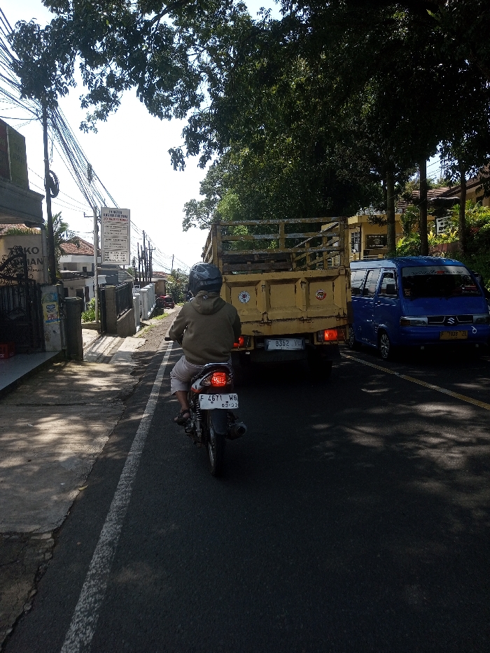 The image displays a street scene in Beteng_Pangkhar_Somthrang, Bhutan, captured during daylight hours. A single individual is visible from the rear, operating a white and black motorcycle equipped with an illuminated red taillight and license plate F 4671 WB. The rider wears a dark full-face helmet, a light brown hooded jacket, and light-colored shorts or trousers. Directly ahead of the motorcycle is a yellow, open-bed truck with a wooden slatted bed, displaying license plate B 8362 YU on its rear. To the right of the truck, a blue van is partially visible, showing a front license plate of T 802 ZL. The paved asphalt road features a solid white line delineating the left shoulder and a dashed yellow line separating traffic lanes further right. On the left side of the road, a concrete sidewalk runs adjacent to a utility pole heavily laden with electrical wires. Beyond this pole, a white rectangular sign with black text, legible sections including "KLINIK," "DOKTER," "Bidan," and "GIGI," is mounted. Further along the left, a building with an ornate metal fence and a "TOKO HIJAB" sign is partially visible, followed by other residential structures. The right side of the scene is characterized by abundant green trees and foliage, with a building facade discernible behind the blue van. A bright, clear sky is visible above, contrasting with the dense tree canopy overhead that casts shadows onto the road. The street appears to ascend gently into the distance.