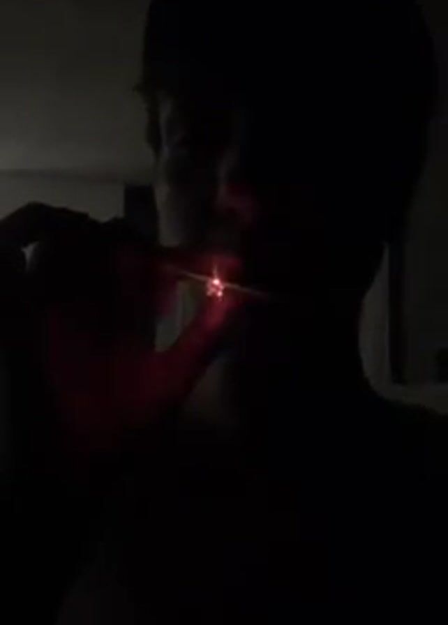 A person is silhouetted in a dark room, smoking something lit with a red glow