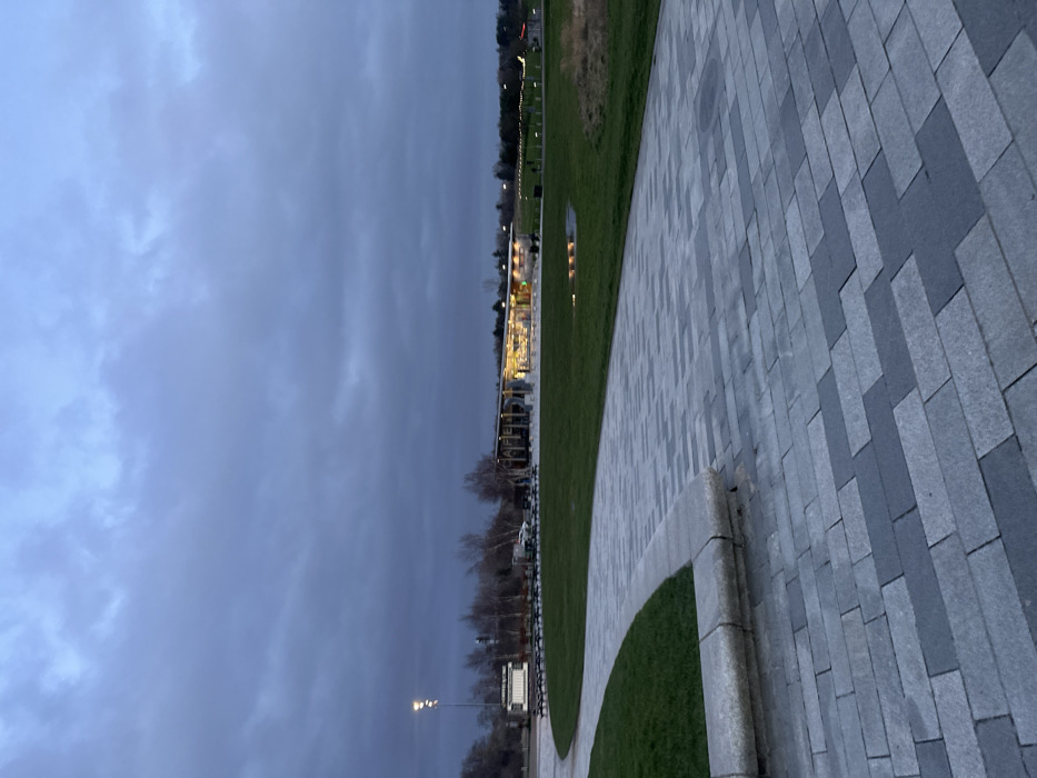 The image depicts The Helix Park in Falkirk, United Kingdom, at dusk or dawn under a heavily overcast, dark grey sky. In the immediate foreground, a wide paved pathway constructed of rectangular grey pavers in varying shades forms a mosaic pattern, extending from the bottom center and curving left into the midground. A raised, light grey stone curb borders the pathway to the left. To the left of the pathway, a manicured green lawn occupies a significant portion of the midground. On the far left, a tall streetlamp with multiple white light sources illuminates a section of the park. Adjacent to the streetlamp, an outdoor seating area features numerous dark tables and chairs arranged in rows. A cluster of bare-branched trees stands behind this seating area. In the mid-right, a modern, single-story building, identified as the Helix Visitor Centre, is illuminated from within, casting warm light through its extensive glass windows. The building has a dark, possibly green, roof extension or canopy. A small puddle on the grass in front of the building reflects light. Further into the background, additional trees and sparse artificial lights are visible along the distant horizon. No individuals are present within the frame.