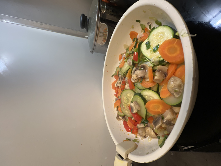 - "A white wok-style pan is tilted towards the viewer, displaying a mix of sliced vegetables" by FM-2ffbq1, licensed under CC BY 4.0