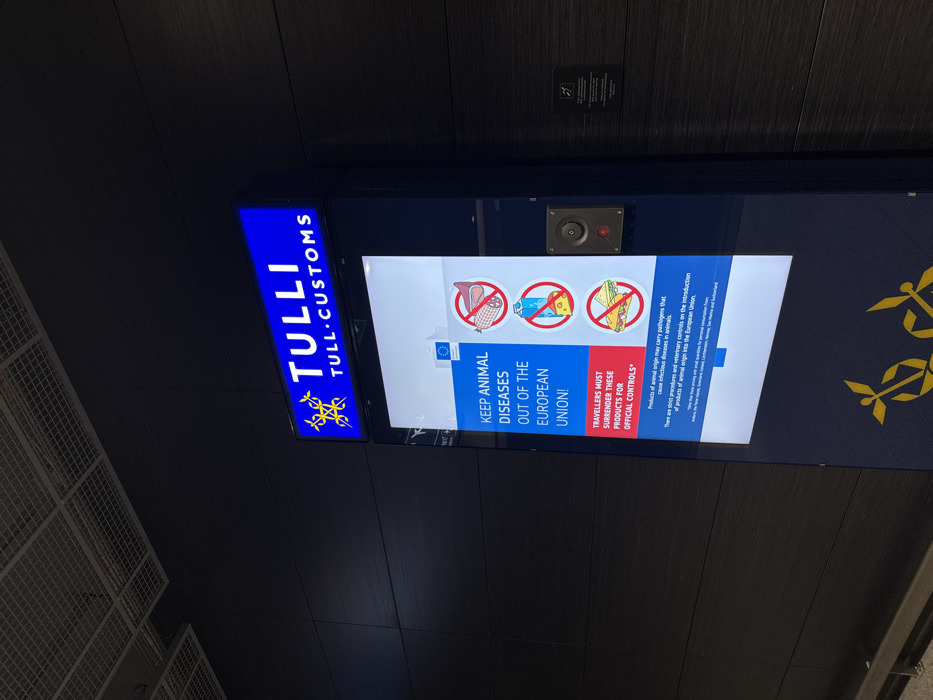An illuminated digital information kiosk from Finnish Customs is centrally positioned within a dark, modern interior, likely at Helsinki-Vantaa Airport in Vantaa, Finland
